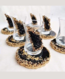 This product is a set of Turkish-style tea glasses paired with matching, handmade resin coasters. The coasters and the glass holders feature a striking geode-inspired design, utilizing black and gold elements, often made with epoxy resin and gold flakes or crushed stones. This style is popular for adding a luxurious, art-deco touch to home decor and can be used for serving tea or coffee