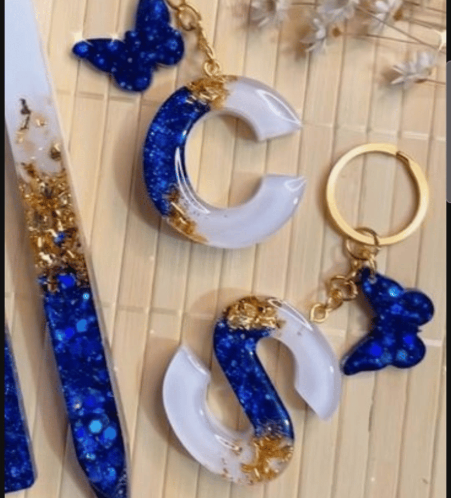 Design & Composition: Each initial is crafted from high-quality epoxy resin. They feature a “split” color design, with a solid navy blue base on the bottom half and a clear top half filled with shimmering gold leaf flakes.